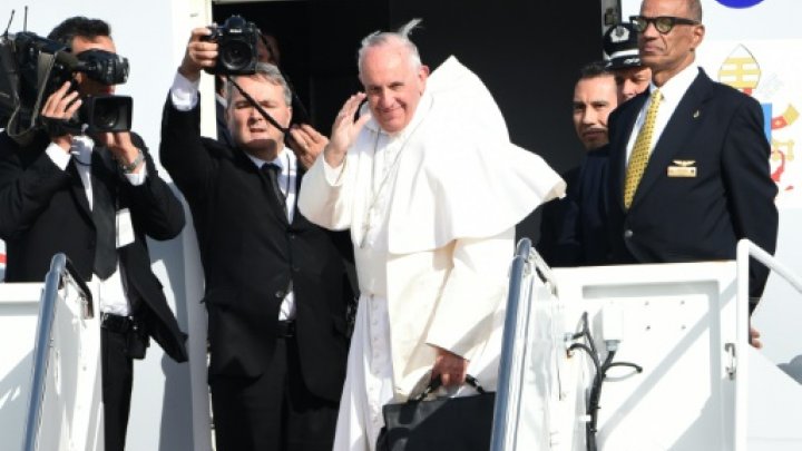 The 78-year-old Argentine pontiff was greeted by delighted cheers as he stepped from the plane in his papal whites, and shook hands with members of the clergy on the tarmac.